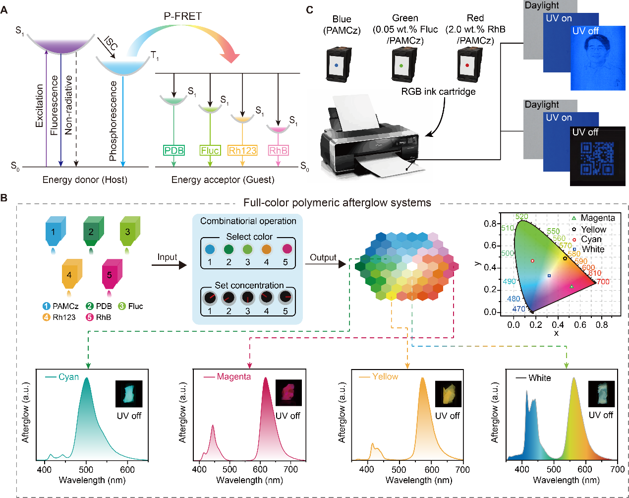 图1:(A)三线态-单线态磷光敏化能量传递策略示意图;(B)全彩有机长余辉材料的构建和(C)安全打印应用