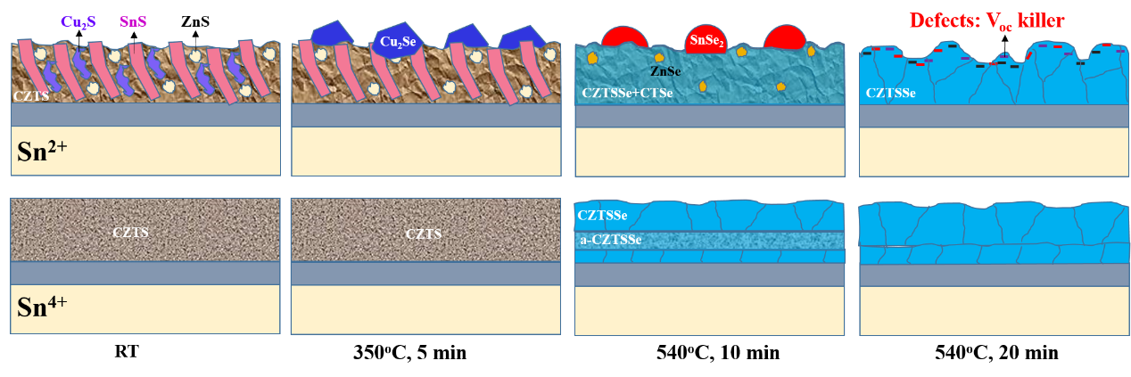 铜锌锡硫(CZTSSe)薄膜电池吸光层材料组成元素地壳丰度高,理论转化效高,是有望实现低成本、高效的绿色光伏技术,但目前铜锌锡硫硒电池的发展遭遇空前的瓶颈期,效率停留在2013年的12.6%。该课题组前期的研究表明,前体锡化合物的两种氧化态(Sn2+和Sn4+)对DMSO溶液法制备的前驱体膜的组成具有显著影响并进而导致CZTSSe电池开路电压的明显不同,由Sn4+溶液获得了效率12.4%,开路电压损失世界最小纪录的CZTSSe电池器件(SCIENCE CHIA Materials, 2020)。课题组以此为基础,深入研究了两种不同前驱体薄膜到吸光层膜的硒化反应路径及晶粒生长过程,发现由Sn2+前体溶液制备的多种二级相(Cu2S, ZnS, SnS, CZTS)组成的前驱体薄膜经历典型的硒化取代反应后再熔合的晶粒生长过程,而最后的融合发生在薄膜表面,导致在薄膜表面形成大量的缺陷,这些缺陷是导致开路电压损失的根本原因,而由Sn4+前驱体溶液获得的前驱体薄膜由单一CZTS相组成,该薄膜经历简单的取代反应和均匀的自上而下和自下而上的晶粒生长路径,得到的薄膜表面缺陷少,电池开路电压高(图1)。