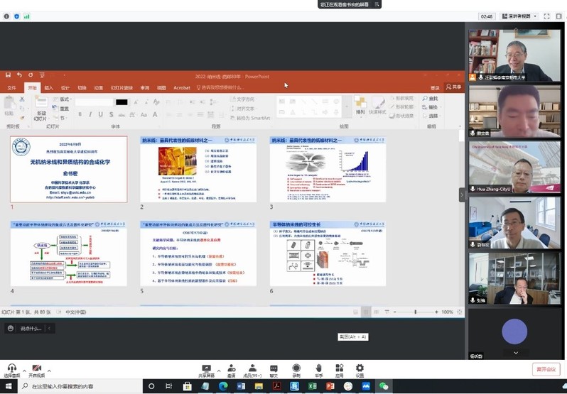 俞书宏院士作题为《无机纳米线和异质结构的合成化学》的学术报告,介绍功能导向的一维纳米材料的精准构筑,基于一维基元的有序组装方法,以及材料在光电转换器件、透明和柔性电极、智能变色等方向的广阔应用前景。与会师生就“纳米材料批量精准制备中的挑战和应用难点”进行了进一步的深入交流。俞院士指出,合成过程的细节决定成败,溶剂的纯度和批次都可能对纳米结构的生长带来一定影响,需要辅助高精密的仪器来观测材料的生长与原位组装过程,以深入理解其中的微观机制。