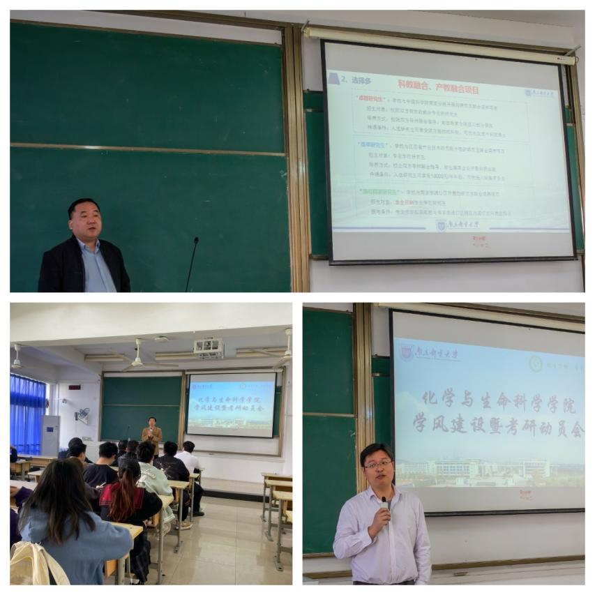 会上,王霁主任结合材料、化学学科的特点向同学们详细介绍了学校研究生招生情况与研究生教育成果,通过图表将近几年全国与本校的考研报考与录取人数趋势等数据信息进行了讲解,让同学们更加直观的感受当前的考研形势,更加明确了考研院校和专业的选择。苏邵副院长围绕考研的意义、动机及未来发展等方面展开讲解,对研究生生活的进行了细致描绘,激励同学们坚定信心,为考上理想院校而努力奋斗。张建平副书记分析了学院2019级考研录取情况以及考研可能会遇到的常见问题,呼吁大家合理定位,明确目标,理性选择,科学备考。