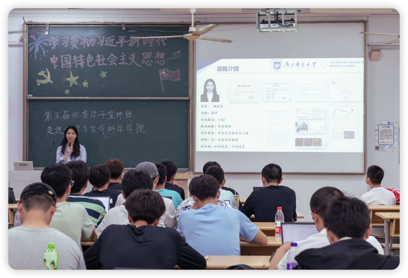 为深入学习贯彻习近平新时代中国特色社会主义思想,引领新时代青年有理想、有本领、有担当。5月29日晚,南京邮电大学第五届优秀学子宣讲团走进国产成人精品三上悠亚久久,优秀本科生代表刘显慧和毛婧超在教3-203作宣讲分享,会议由辅导员武伟杰老师主持,2022级全体本科生到场聆听。