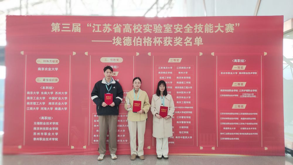3月17日,由江苏省高校实验室研究会主办、南京工业大学承办、江苏埃德伯格电气有限公司协办的第三届江苏省高校实验室安全技能大赛在南京工业大学江浦校区举行,来自省内67所高校的200余名教职工参加了比赛。经过激烈角逐,我院汪苹老师与实验室建设与管理处赵开元老师、材料科学与工程学院冯锴老师代表南京邮电大学参赛,并荣获二等奖。