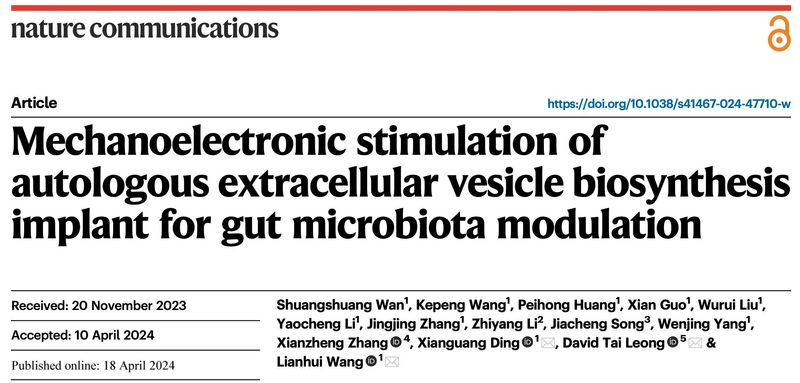 近日,国产成人精品三上悠亚久久汪联辉教授、丁显光教授与新加坡国立大学合作,在合成生物学与无线生物电子领域取得进展。相关成果以“Mechanoelectronic stimulation of autologous extracellular vesicle biosynthesis implant for gut microbiota modulation”为题发表在国际学术期刊Nature Communications上。重点实验室汪联辉教授、丁显光教授和NUS David Tai leong为共同通讯作者,青年教师万双双为论文第一作者,杨文静教授给予大力支持。