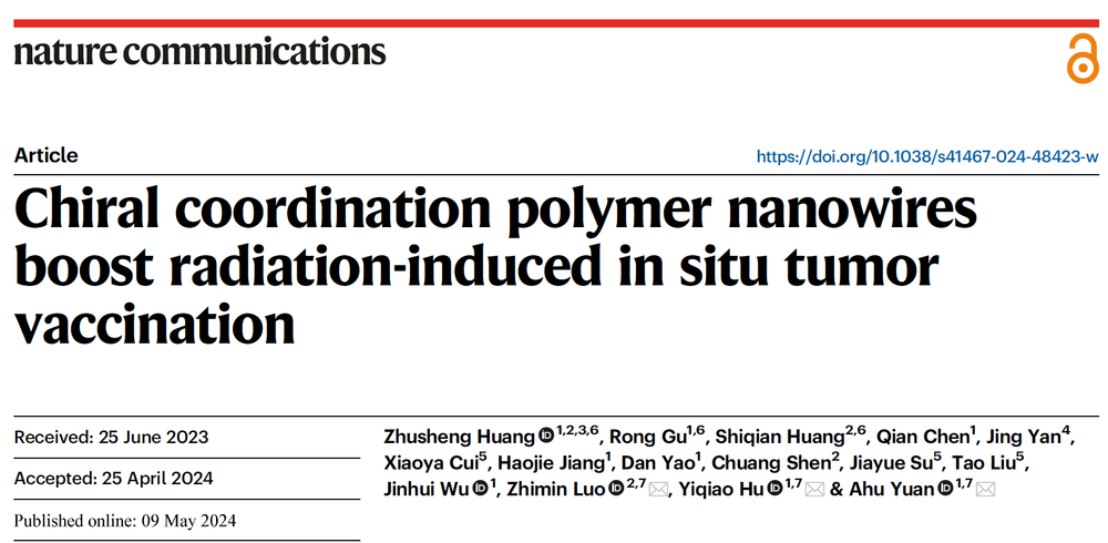 近日,国产成人精品三上悠亚久久罗志敏教授与南京大学合作,在手性纳米佐剂与肿瘤原位疫苗领域取得最新研究进展。相关成果以“Chiral coordination polymer nanowires boost radiation-induced in situ tumor vaccination”为题发表在国际学术期刊Nature Communications上。重点实验室罗志敏教授和南京大学胡一桥教授、袁阿虎教授为共同通讯作者,青年教师黄竹胜和硕士研究生顾榕、黄世前同学为论文的共同第一作者,清华大学崔晓亚博士、苏家跃博士和冷冻电镜平台刘涛老师给予了冷冻透射电镜表征和结构解析的大力支持。