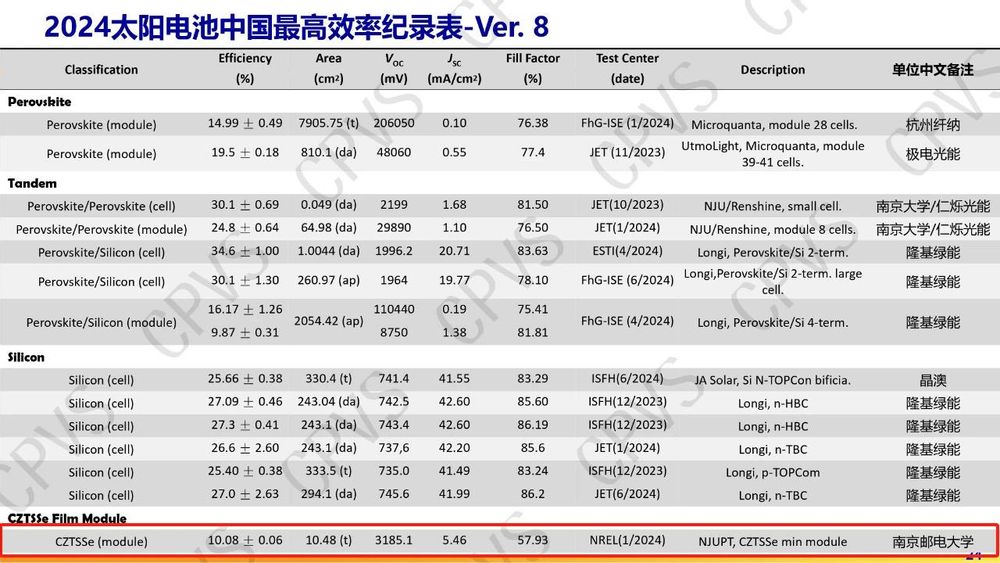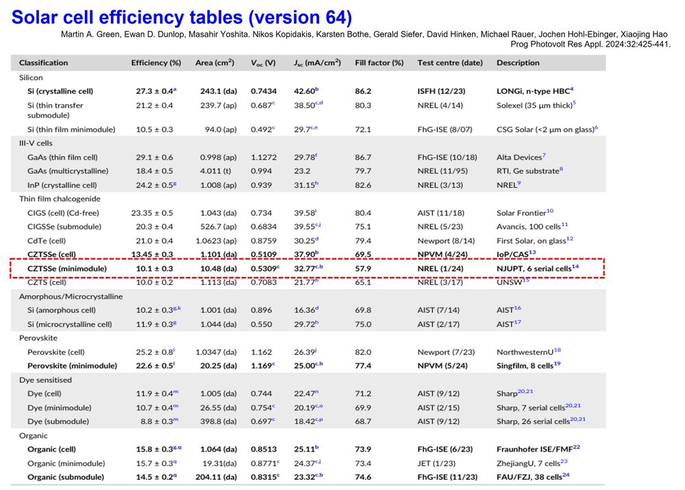 2024太阳电池中国最高效率记录表收录南京邮电大学辛颢团队CZTSSe组件认证效率