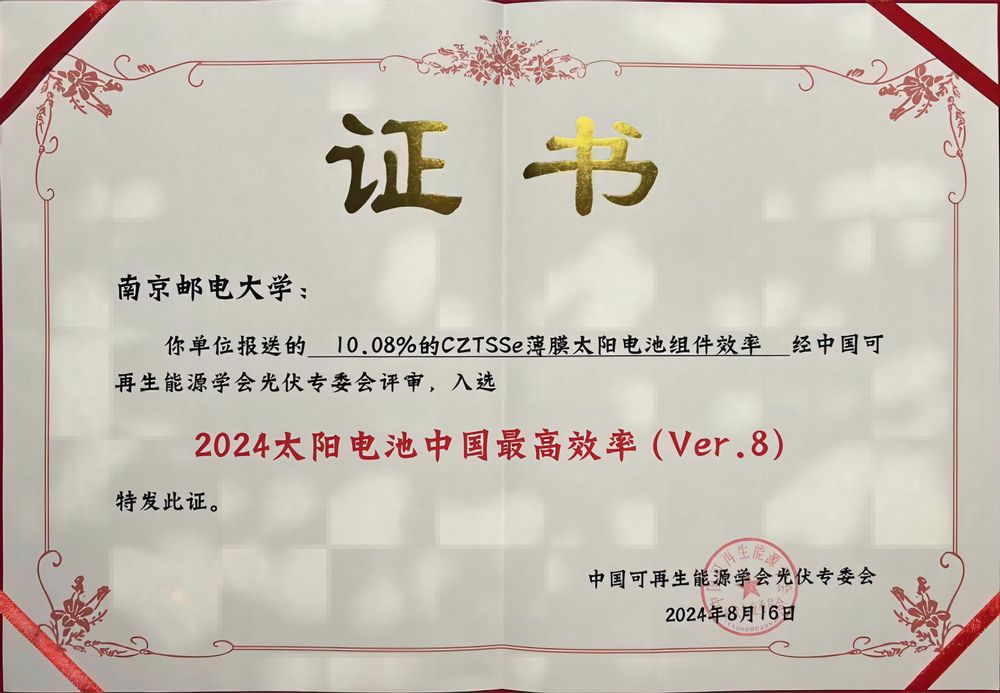 南京邮电大学2024太阳电池中国最高效率获奖证书