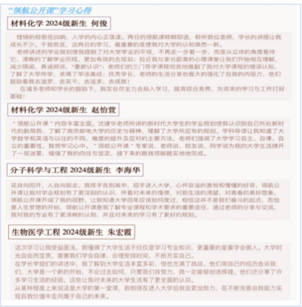 “学而时习之,不亦说乎?”此次领航公开课围绕学生自主学习意识养成、科研素养能力提升、职业生涯规划设计、心理健康教育引导等专题,邀请14位嘉宾进行授课,通过身边人讲身边事,用身边事影响身边人,帮助新生播撒科研的火种,规划未来的蓝图,守护心灵的绿洲,建立安全的第一道防线。学院精心组织全体2024级新生及其家长共同参与学习活动。在这次活动中,学生们不仅积极参与观看直播,还提交了观看照片、学习心得以及详细的学习笔记。学院对学生们提交的内容进行了认真细致的查看,并对表现突出的学生给予了表扬,以鼓励他们继续保持这种积极主动的学习态度。