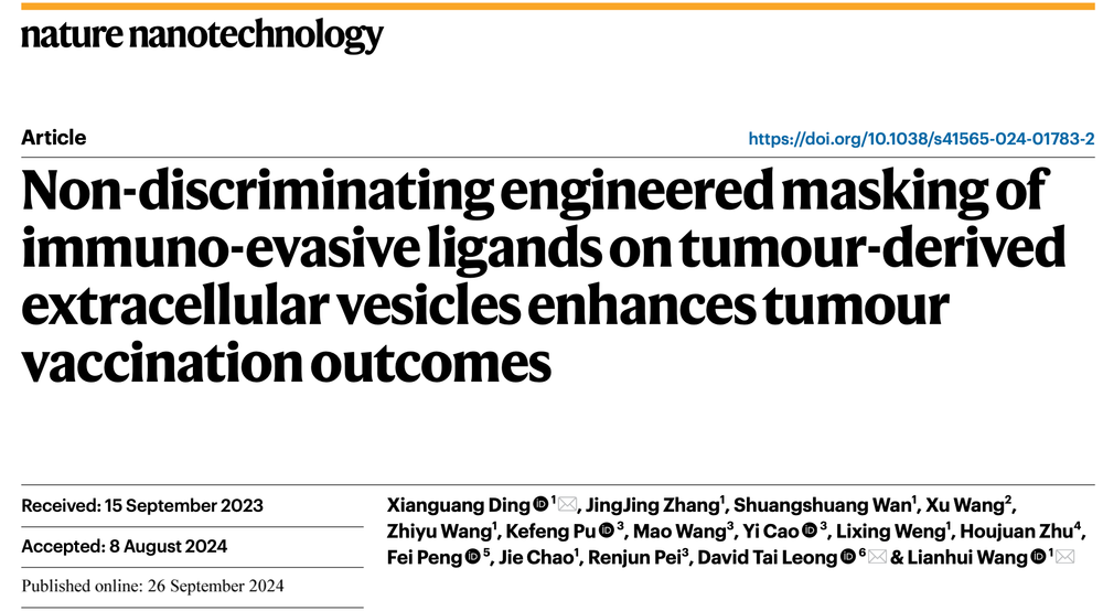 近日,南京邮电大学有机电子与信息显示国家重点实验室及国产成人精品三上悠亚久久汪联辉教授、丁显光教授团队与新加坡国立大学David Tai Leong团队合作,在自体肿瘤疫苗领域取得进展,相关成果以“Non-discriminating engineered masking of immuno-evasive ligands on tumour-derived extracellular vesicles enhances tumour vaccination outcomes”为题发表在国际学术期刊Nature Nanotechnology上。