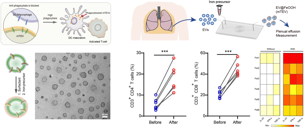 与通过基因工程手段在体外改造高度敏感、高度异质性的免疫细胞相比,设计自体肿瘤疫苗以在体内激活免疫细胞,成为一种有前景的自体免疫治疗策略。肿瘤细胞能够源源不断、高产率生成和释放囊泡到组织液和体液中,这些肿瘤来源的囊泡富含大量反映其肿瘤来源的特征蛋白和核酸抗原,为免疫细胞提供了高丰度的肿瘤抗原信息。此外,这种癌性囊泡的收集相对简单,不仅可以从临床切除的组织中培养癌细胞获得,还可以直接从患者的生理、病理体液(如恶性腹水或胸腔积液)中大量提取。因此,利用癌性囊泡制备自体肿瘤疫苗,用于免疫疗法具有很大优势。团队前期对生物囊泡材料的成分解析、有效利用进行了系列研究(Anal. Chem. 2022, 14794; Adv. Sci. 2023, 2204814; ACS Nano 2024, 9613; Nature Communications 2024, 3343),最新研究发现,癌细胞释放的囊泡表面可能携带免疫逃逸分子,这些分子干扰了免疫细胞的吞噬信号,导致免疫细胞无法摄取癌性抗原,进一步影响其有效识别和攻击肿瘤。因此,调控免疫细胞与癌性囊泡之间的生物信号识别,成为有效利用癌性囊泡抗原,研发自体肿瘤疫苗的关键。