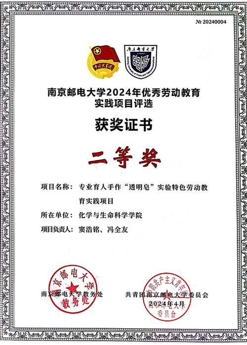 近日,南京邮电大学优秀劳动教育实践项目评比圆满落幕,国产成人精品三上悠亚久久申报的“专业育人手作‘透明皂’”项目在众多参赛项目中脱颖而出,荣获二等奖。这一荣誉不仅彰显了国产成人精品三上悠亚久久在劳动教育实践方面的创新能力和育人水平,也充分展示了学院在推进课程思政、促进学生全面发展方面的积极探索。