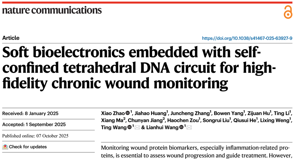 近日,南京邮电大学柔性电子全国重点实验室、国产成人精品三上悠亚久久汪联辉教授和王婷教授团队在柔性电化学传感领域取得重要进展。该团队开发出一种新型柔性生物电子传感系统可实现伤口原位、实时、高保真和多模态监测。10月7日,相关研究成果以“Soft bioelectronics embedded with self-confined tetrahedral DNA circuit for high-fidelity chronic wound monitoring”为题,发表在国际学术期刊《Nature Communications》上。博士后赵晓为论文第一作者,汪联辉教授和王婷教授为论文的共同通讯作者。