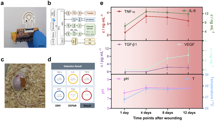 结合无线通讯模块,该平台可同时监测多种伤口愈合相关蛋白质(TNF-α、IL-6、TGF-β1和VEGF)以及pH值、温度等关键生理参数(图2a-c)。该无线传感平台可在不会妨碍愈合情况下实现对糖尿病小鼠未感染伤口和感染伤口准确、原位监测(图2d, e)。相较于传统伤口监测手段,该柔性传感系统提高了灵敏度和稳定性,同时能够实时、多参数检测,未来有望基于分子特征指导治疗决策,并与智能敷料集成实现响应式治疗。