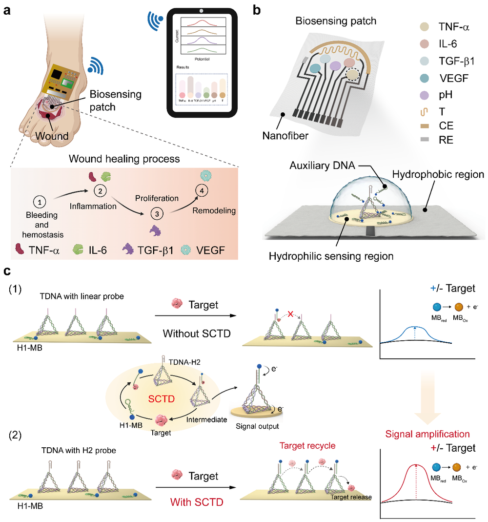 慢性伤口的评估与治疗是临床医学的一大挑战。伤口处的蛋白质,特别是炎症相关蛋白,是判断愈合进展的关键“信使”。然而,这些蛋白质生物标志物在伤口渗出液中浓度极低,且伤口环境复杂,导致现有生物传感器普遍面临以下难题:灵敏度不足、易受人体活动干扰、长期使用性能下降且易被污染。针对上述伤口生物传感面临的问题,汪联辉教授和王婷教授团队开发了一种自限域四面体DNA循环放大电路(SCTD)嵌入式柔性生物传感器用于全面、高保真监测伤口各阶段特异性蛋白质和生物物理指标(图1a)。借助图案化润湿性纳米纤维贴片实现伤口渗出液富集并防止辅助DNA扩散,从而在不妨碍伤口愈合的情况下形成亲水性生物传感反应池(图 1b)。SCTD通过外源辅助核酸预固定策略和空间限域策略实现目标蛋白质触发的SCTD信号放大(图1c),将检测限降低一个数量级。四面体DNA结构确保了高保真检测,测试表明即使在1000次弯曲循环后,信号变化仍在3%以内;4周内信号衰减低于8%;同时,其抗生物污染能力也提升了超过50%,能有效抵抗伤口复杂环境的干扰。